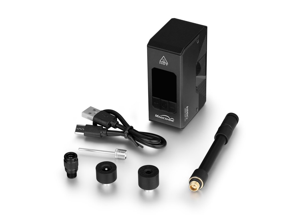 elektrická mini pumpička, adaptér pro ventilky Presta a Schrader, prodlužovací hadička, jehla na míče, silikonový ochranný obal, voděodolný sáček, USB-C nabíjecí kabel a uživatelský manuál.